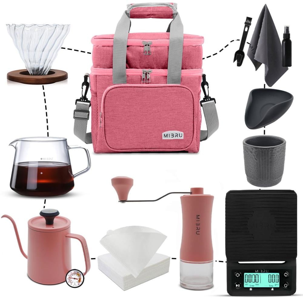 مجموعة ادوات بالتنقيط الاحترافية للقهوة المختصة بلون وردي، فلاتر قهوة ، كوب قهوة ، ميزان قهوة ، سيرفر خادم زجاجي ، مطحنة قهوة ، قمع سيراميك ، ابريق تنقيط قهوة ، ادوات باريستا , شنطة قهوة مختصة ومجموعة مناسبة للرحلات ، والسفر ، والتخييم ، وهدية مناسبة
