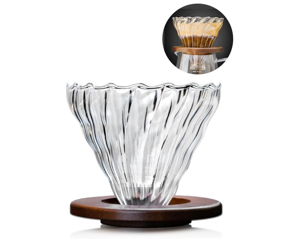 - قمع زجاجي بحلقة خشبية حجم كبير 02 مناسب لتقطير من 1-4 اكواب ومناسب لفلاتر القهوة مقاس صغير وكبير