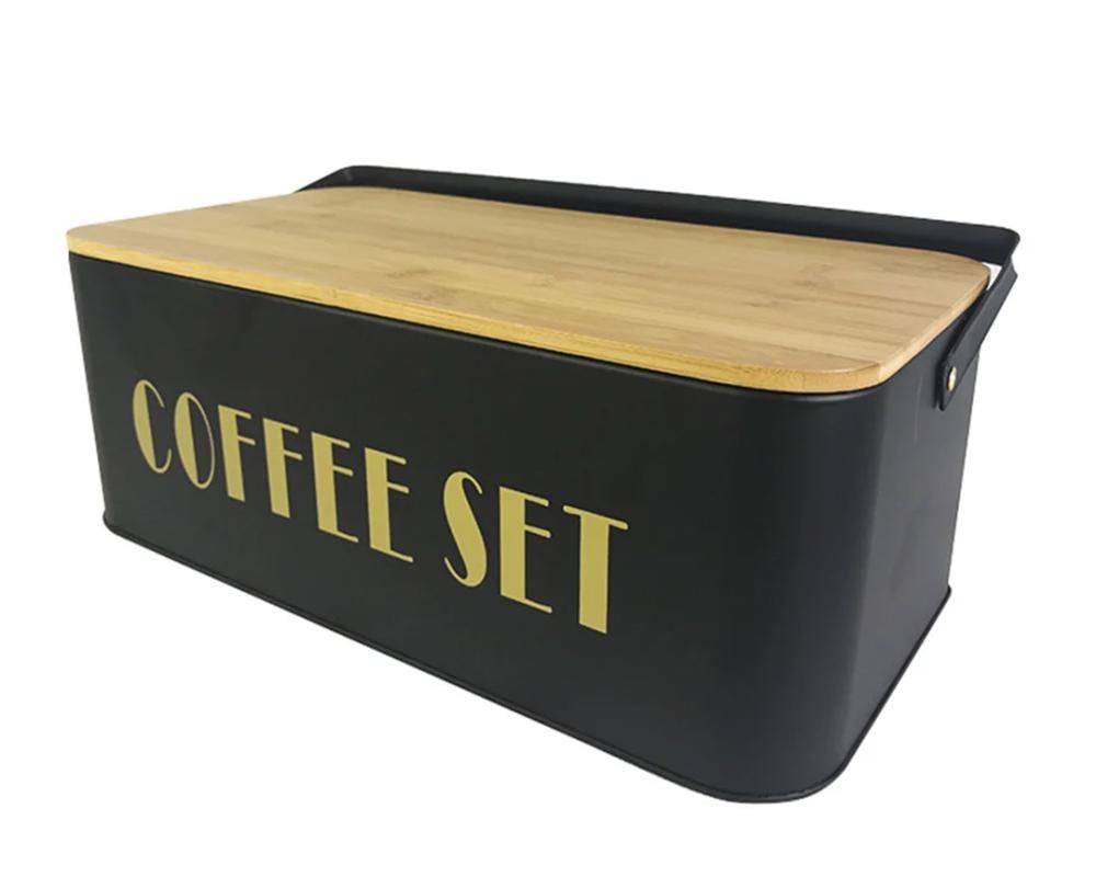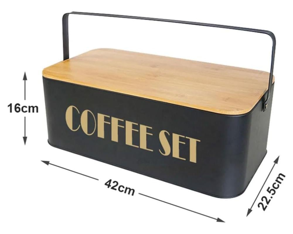 صُنع من المعدن المتين مع غطاء خشبي أنيق، بتصميم عملي ومقاس مثالي لحفظ جميع أدواتك بترتيب وأناقة. مزود بمقبض حمل مريح ليكون رفيقك المثالي أينما كنت. أضف لمسة تنظيم وفخامة لركن القهوة الخاص بك!