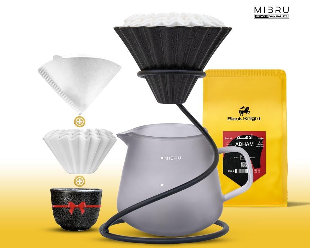 مجموعة ابريق و قمع تقطير و قاعدة معدنية مع نوعين فلاتر ورقية+كوب قهوة + محصول قهوة فاخر من الفارس الاسود ادهم