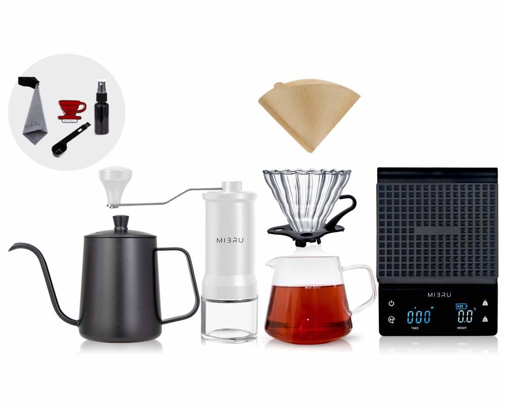 مجموعة في 60 طقم من 7 قطع , سيرفر زجاجي,قمع بالتنقيط,فلتر في 60,ميزان الكتروني,مطحنة قهوة,ابريق بالتقطير, ادوات باريستا تنظيف
