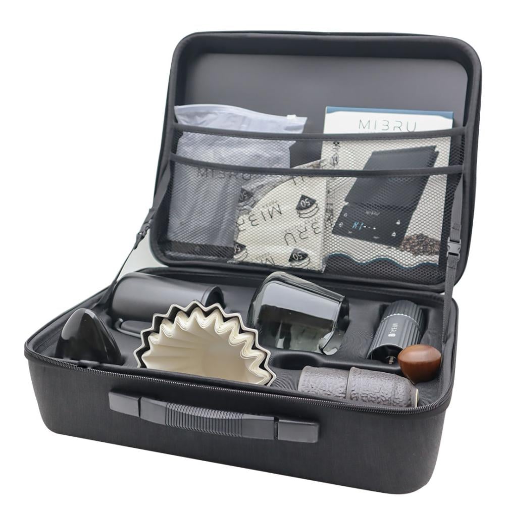 باقة توفيرية متكاملة ، تضم أحدث شنطة بمجموعة متكاملة لتقطير القهوة في السفر والرحلات بتصميم عصري للاستغلال المساحة وخفة الوزن